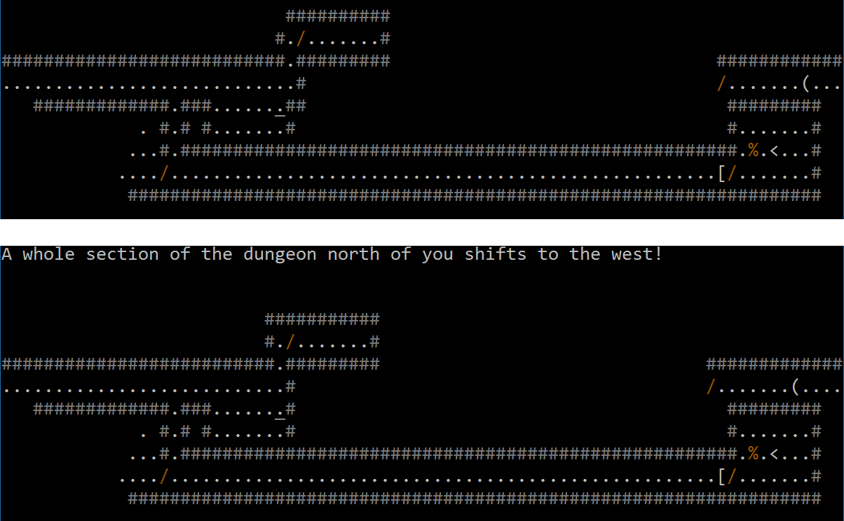 Shifting dungeon levels have a horizontal or vertical strip of dungeon squares which move one square every few turns. Horizontal strips move either east or west, and vertical strips move either north or south. When dungeon squares are pushed off screen, they appear on the opposite side of the screen. The message "You hear a violent grating sound!" is produced whenever the dungeon shifts out of line of sight. The message "A whole section of the dungeon {cardinal direction} of you shifts to the {cardinal direction}!" is produced when the PC can see the dungeon shift. The message "A whole section of dungeon shifts to the {cardinal direction}! Everything is shaking violently!" is produced when the PC is shifted.