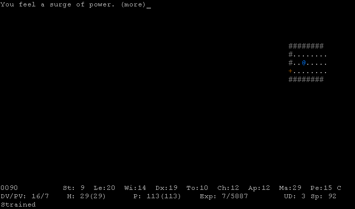 A surge of power is a special event in ADOM. Upon entering certain levels (exceptions: the piranha lake level, the Bug Temple cave etc.) for the first time, some items will be generated on the floor. If one of these items is an artifact[1], the player is alerted by the message "You feel a surge of power." and a "(more)" prompt.